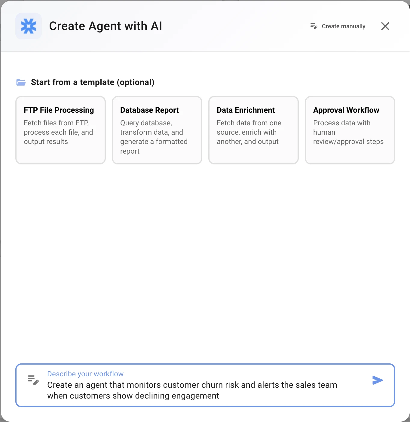 The agent builder uses a conversational AI interface to help you create an initial workflow scaffold through natural language.
