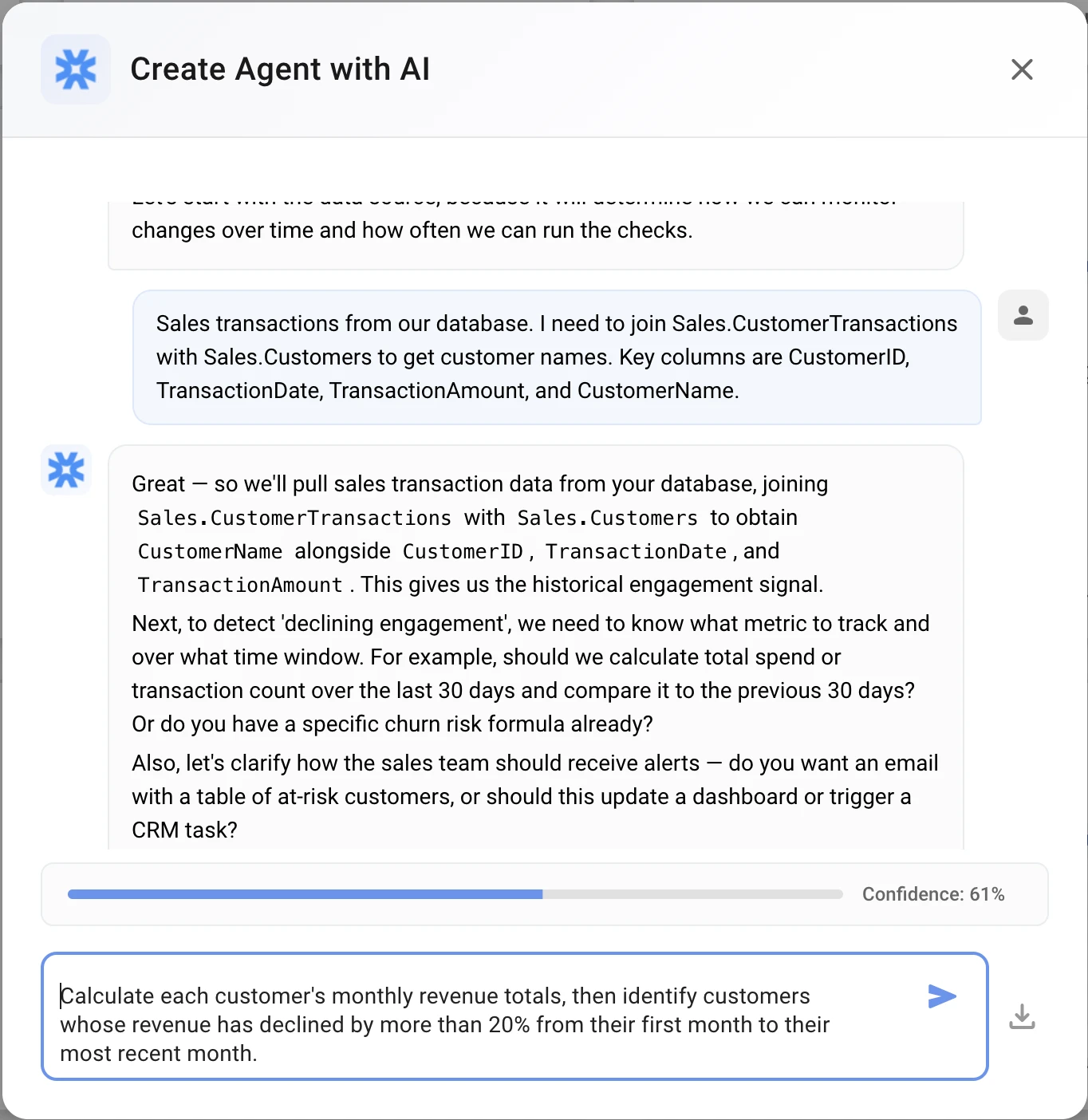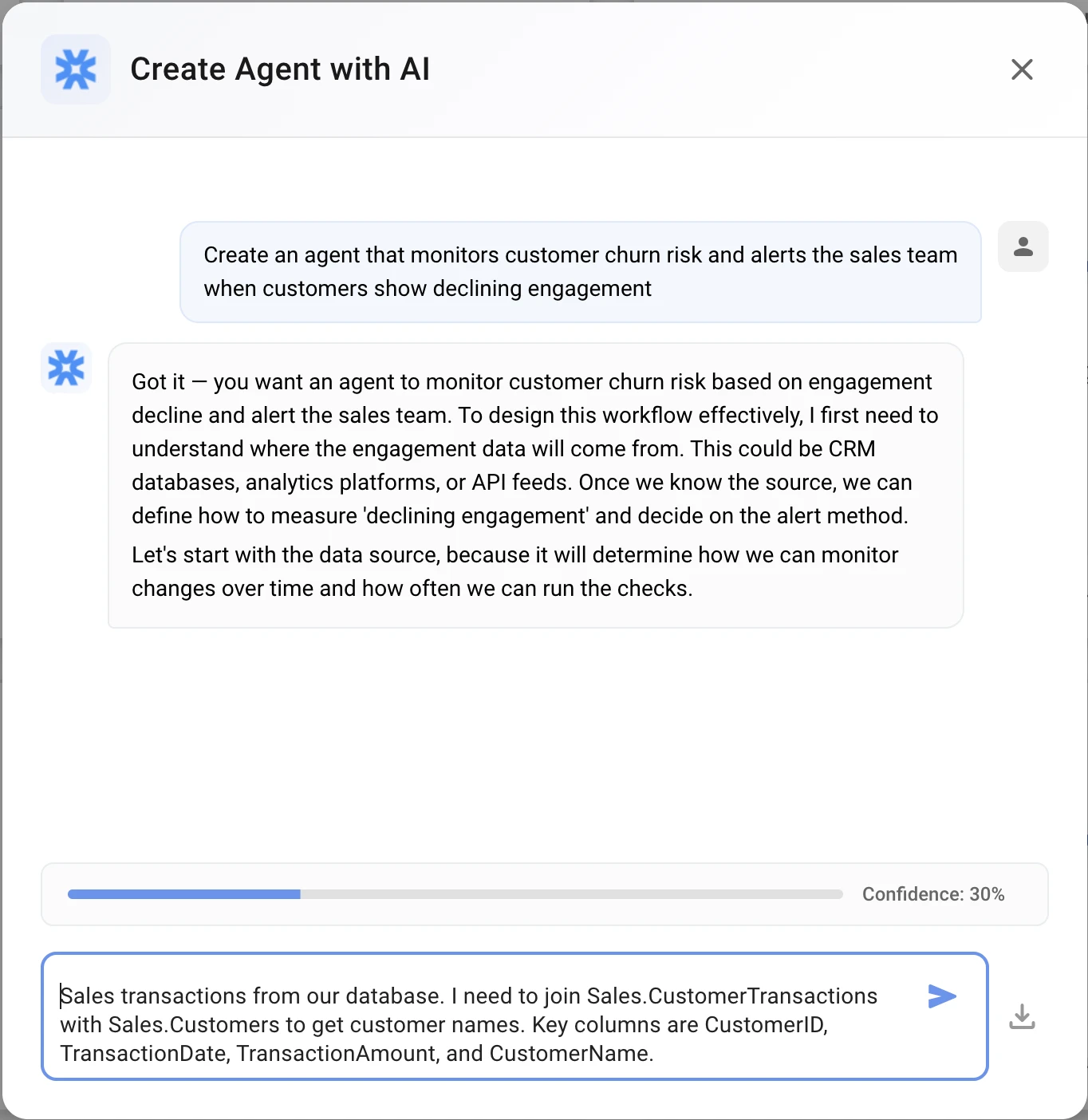 AI asks: "What data source contains your customer transaction history?"