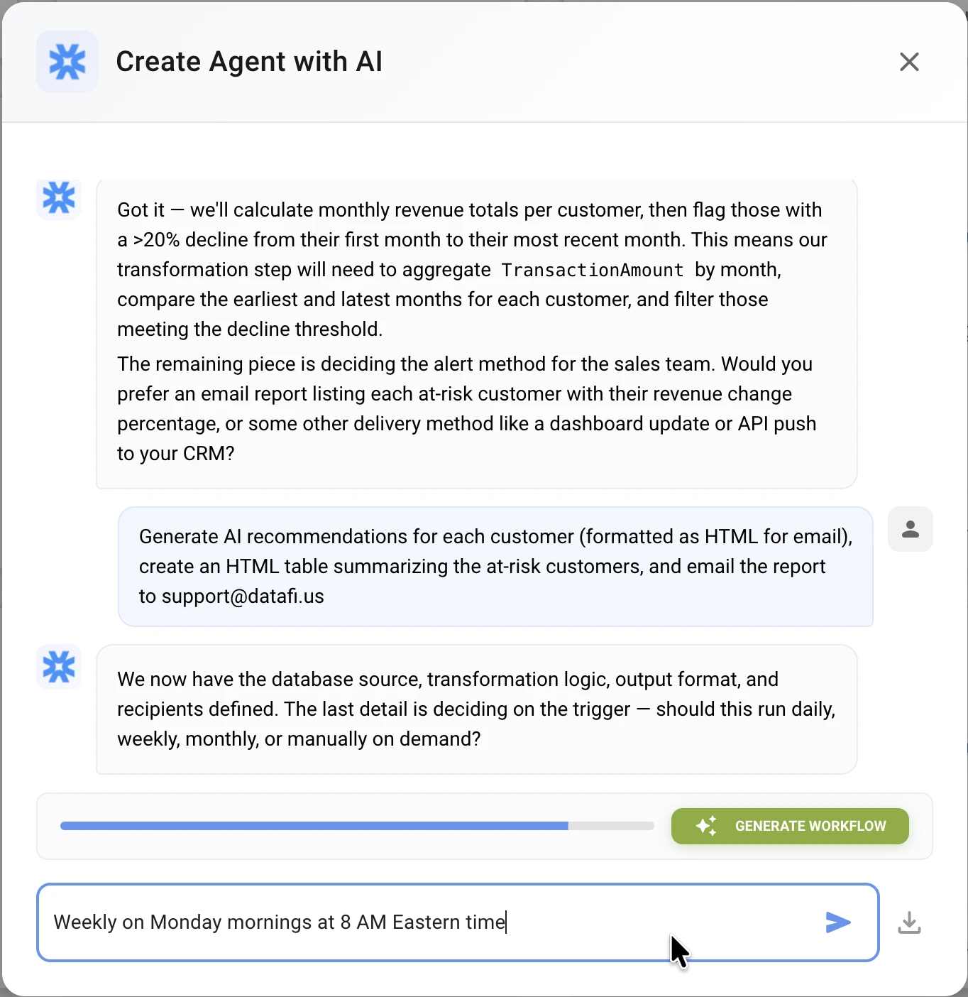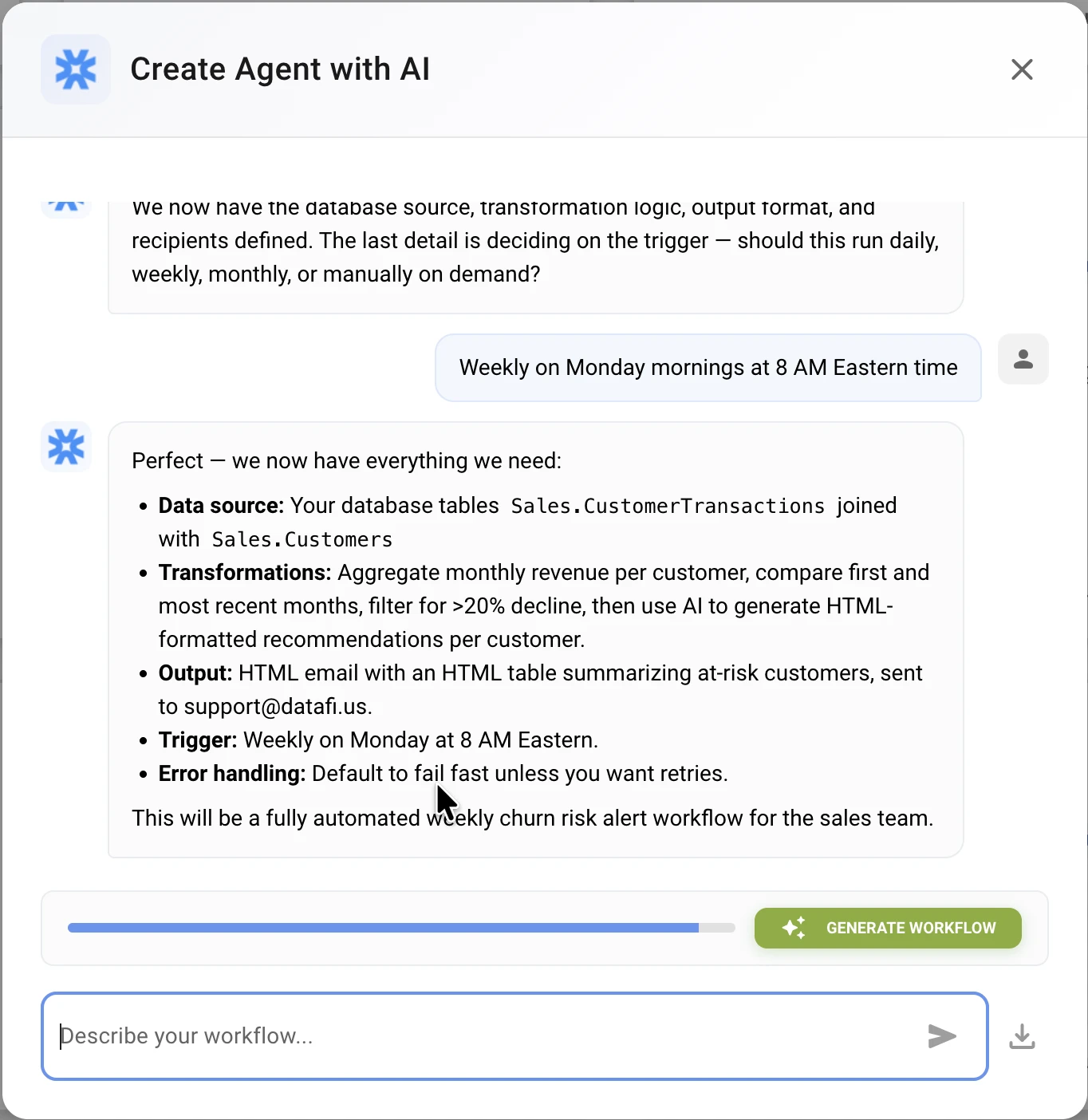 When the confidence indicator reaches the threshold (typically 80%+), click "Generate Workflow".